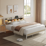 1 review for Bed Frame with Storage Headboard & LED Lights, Metal Platform Bed with Folding Shelves and Charging Station, No Box Spring Needed, Easy Assembly, Noise-Free, White, King